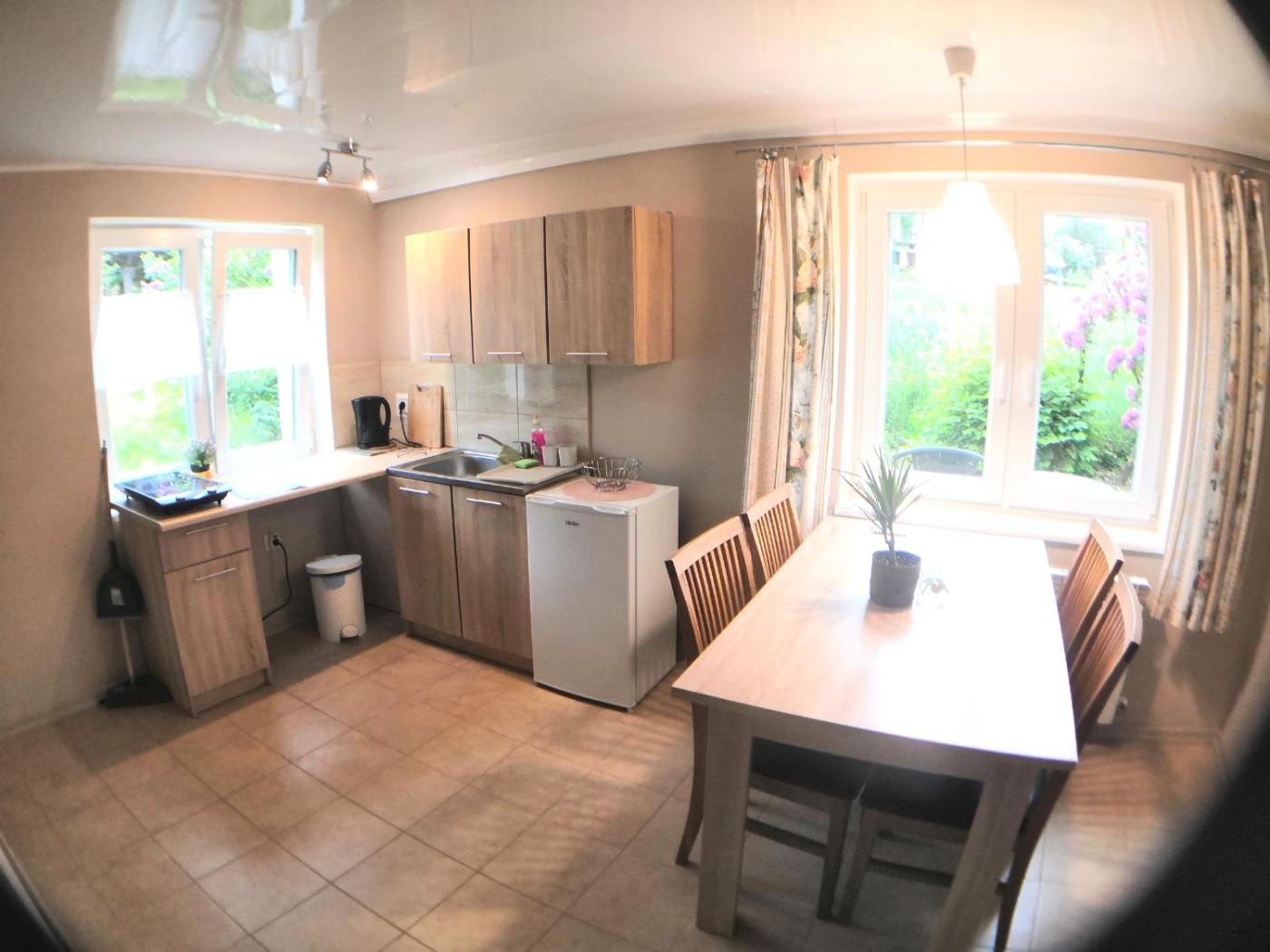 Studio typu Standard. The studio offers a wardrobe, a sofa, as well as a private bathroom featuring a shower and a hairdryer. Guests will find a stovetop, a refrigerator and kitchenware in the kitchen. The studio also offers a barbecue. The studio provides a flat-screen TV with streaming services, a tea and coffee maker, a seating area, a dining area as well as garden views. The unit offers 1 bed. Studio - 2 osobowy. Powierzchnia pokoju ok.: 30 mkw.